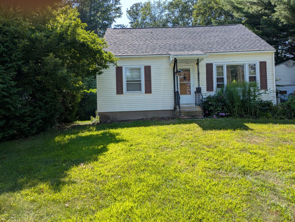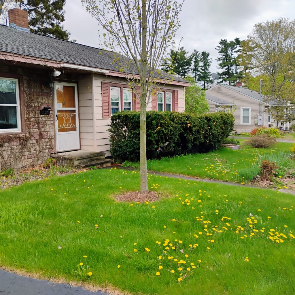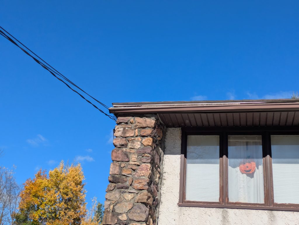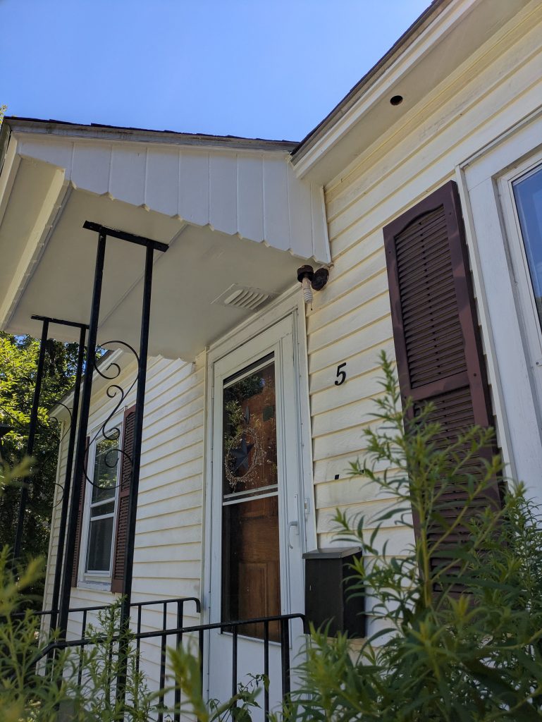 - Remove and dispose of shrubs from in front of home; evaluate, repair and paint fascia, soffit and entry roof. Install gutter and downspout over entry.