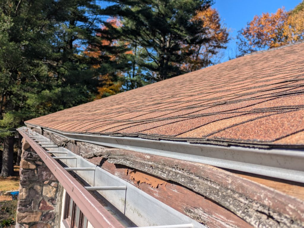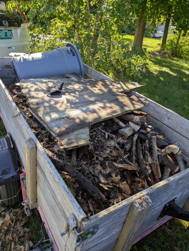 - Removed rotten overhanging shed roof, clean out and dispose of contents, roll roofing and fascia to close the trimmed rafters.